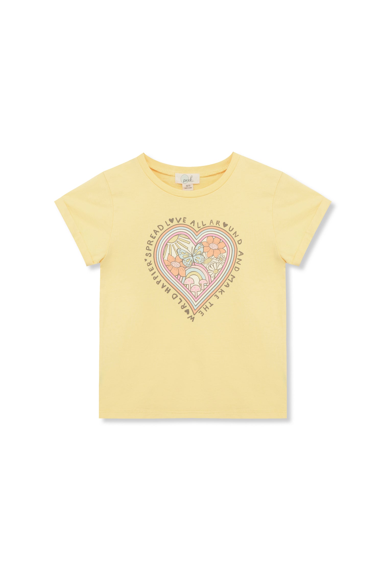 Spread love all around and make the world happier tee! Radiate positivity with this light yellow tee.